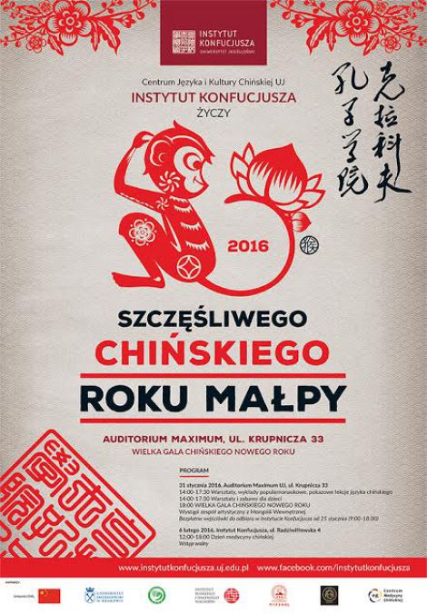 Instytut Konfucjusza w Krakowie serdecznie zaprasza wszystkich na uroczyste powitanie chińskiego Roku Małpy, które odbędzie się w niedzielę 31 stycznia 2016 roku w Auditorium Maximum UJ.