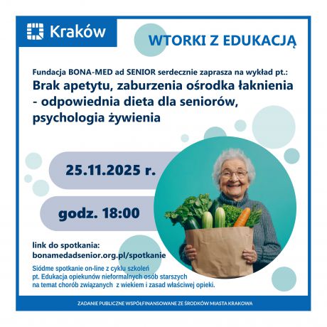 Serdecznie zapraszamy wszystkie osoby opiekujące się osobami starszymi na wykład on-line: Brak apetytu, zaburzenia ośrodka łaknienia – odpowiednia dieta dla seniorów, psychologia żywienia.