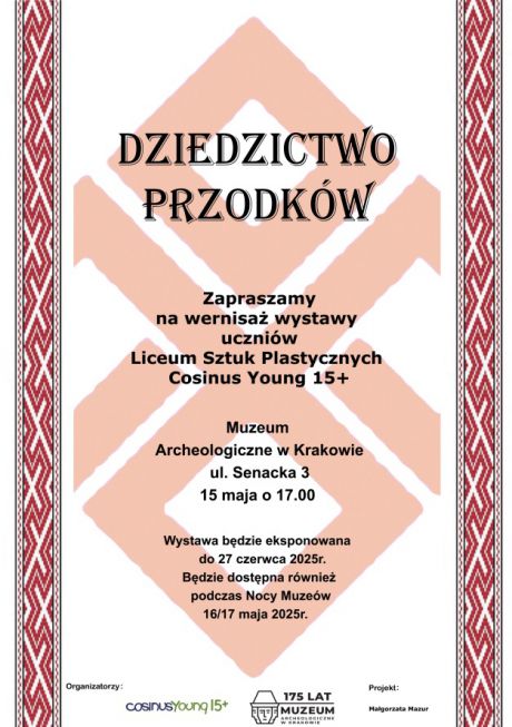 Naczynia, suknię oraz biżuterię ceramiczną, wykonaną przez uczniów Liceum Sztuk Plastycznych Cosinus w Krakowie wedle własnych pomysłów, ale barwą i wzornictwem nawiązujące do tradycji słowiańskiej, będzie można podziwiać w Muzeum Archeologicznym przy ul. Senackiej 3 w Krakowie. Wernisaż wystawy „Dziedzictwo przodków” odbędzie się w czwartek 15 maja 2025 roku o godz. 17-tej.