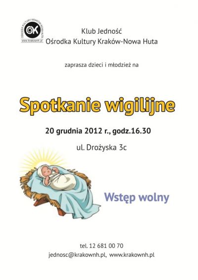 Spotkanie wigilijne dla dzieci i modziey w Klubie Jedno Orodka Kultury Krakw-Nowa Huta. wita to bardzo szczeglny i radosny okres w roku, dlatego pragniemy podzieli si opatkiem ze wszystkimi dziemi uczszczajcymi na zajcia do Klubu, zoymy sobie yczenia oraz bdziemy piewa koldy przy odwitnie ubranej choince.