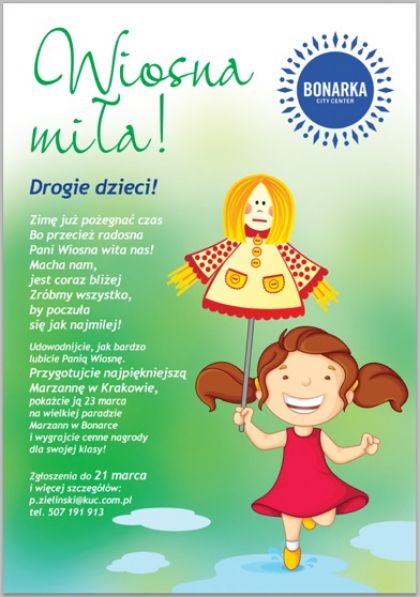 Ju 23 marca w Bonarka City Center odbdzie si wielka parada Marzann. Za ich pomoc dzieci z krakowskich szk nie tylko na dobre przegoni zim, ale zawalcz o cenne nagrody. W jury oceniajcym wystp zasidzie m.in. znana aktorka Magorzata Kouchowska, bdca ambasadork Bonarki.