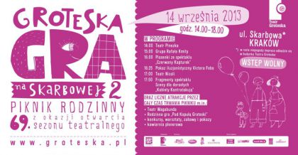 Teatr Groteska zaprasza wszystkich na plenerowy piknik rodzinny organizowany z okazji rozpoczcia nowego, 69. sezonu teatralnego w dniu 14 wrzenia w godzinach 14.0018.00.