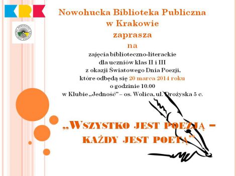 W cyklu: Akademia rozwoju wyobrani w Punkcie Bibliotecznym w Wolicy z okazji wiatowego Dnia Poezji odbd si zajcia biblioteczno-literackie dla uczniw klas II i III pn. Wszystko jest poezj kady jest poet.