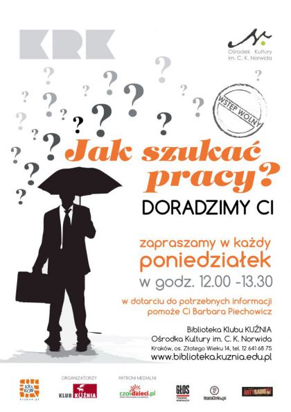 Zapraszamy na konsultacje adresowane do osb, ktre poszukuj pracy. W kady poniedziaek w godz. 12.00 13.30 w Bibliotece Klubu Kunia OKN pomoemy zainteresowanym w dotarciu do biecych ofert pracy zamieszczonych na stronach internetowych oraz ogosze prasowych, dostpnych w bibliotece.