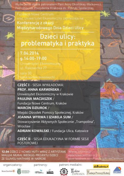 Fundacja Nowe Centrum oraz Uniwersytet Ekonomiczny zapraszaj na konferencj Dzieci ulicy problematyka i praktyka, ktra odbdzie si 7 kwietnia na Kampusie Uniwersytetu Ekonomicznego w Krakowie. Konferencja objta jest patronatem penomocnika Prezydenta Krakowa ds. Polityki Spoecznej - Pani Anny Okoskiej - Walkowicz.