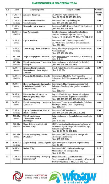 Fundacja Rozwoju Gmin Polskich zaprasza mieszkacw Krakowa oraz jego okolic do uczestniczenia w spacerach przyrodniczych organizowanych na terenie miasta Krakowa i okolic, ktre bd si odbywa w okresie czerwiec sierpie 2014 wedug poniszego harmonogramu: