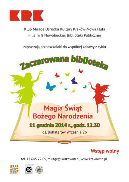 Serdecznie zapraszamy na kolejne spotkanie dla przedszkolakw z cyklu Zaczarowana biblioteka w Klubie Mirage Orodka Kultury Krakw-Nowa Huta (os. Bohaterw Wrzenia 26). Tematyk spotkania, ktre odbdzie si 11 grudnia o godz. 12.30 bd tradycje i zwyczaje zwizane z magicznymi zimowymi witami.