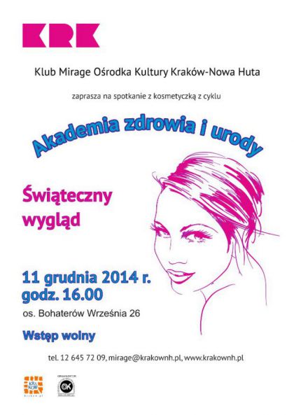 | Klub Mirage Orodka Kultury Krakw-Nowa Huta zaprasza na przedwiteczne spotkanie dla pa z ramach cyklu Akademia Zdrowia i Urody. Uczestniczki dowiedz si jak w prosty sposb, po przedwitecznym zamieszaniu i porzdkach, wyglda piknie i promiennie przy witecznym stole a odwitnym makijaem przykuwa wzrok goci i domownikw. Konsultantki wykonaj zabiegi na twarz oraz pokaz makijau, udziel indywidualnych porad a zainteresowani bd mo(...) ... więcej » |