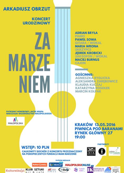 13 maja o godzinie 19:00 w Piwnicy Pod Baranami pod Honorowym Patronatem Jacka Krupy Marszaka Wojewdztwa Maopolskiego odbdzie si koncert urodzinowy Za marzeniem aktora-wokalisty Arkadiusza Obrzuta!