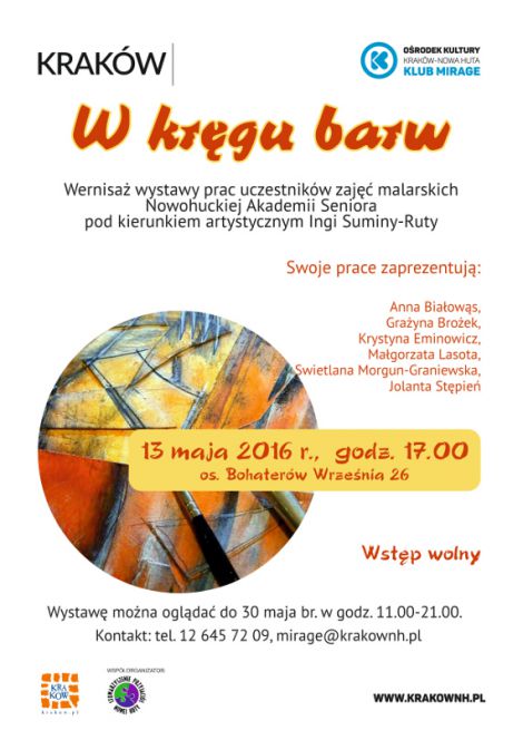| Klub Mirage Orodka Kultury Krakw-Nowa Huta wraz z Nowohuck Akademi Seniora serdecznie zapraszaj na wernisa wystawy malarstwa i rysunku uczestnikw zaj prowadzonych przez artystk-malark Inh Sumina-Ruta, ktry odbdzie si 13 maja o godz. 17:00 na os. Bohaterw Wrzenia 26. Na wystawie prac zaprezentuj: Krystyna Eminowicz, Grayna Broek, Magorzata Lasota, Anna Biaows, Swietlana Morgun-Graniewska oraz Jolanta Stpie. Na obrazach zo(...) ... więcej » |