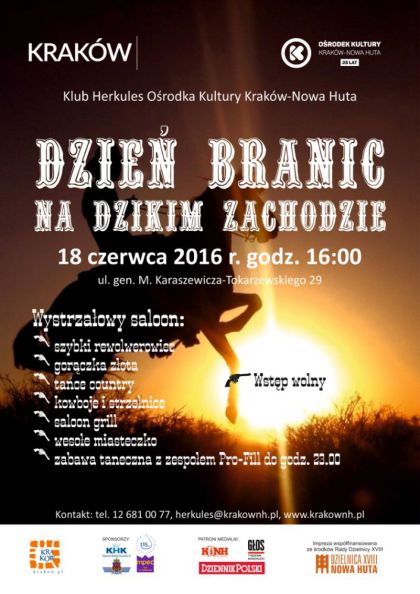 | Klub Herkules Orodka Kultury Krakw-Nowa Huta (ul. gen. M. Karaszewicza-Tokarzewskiego 29) zaprasza 18 czerwca w godz. 16.00-23.00 na rodzinn imprez plenerow Dzie Branic - Na dzikim zachodzie. Wydarzeniu towarzyszy bd tematyczne konkursy i zabawy: wystrzaowy saloon, szybki rewolwerowiec, gorczka zota, tace country, kowboje i strzelnice, a take akcje plastyczne, loteria fantowa, wesoe miasteczko oraz saloon grill. Z repertuarem coun(...) ... więcej » |
