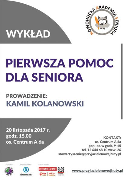 Nowohucka Akademia Seniora (os. Centrum A 6a) zaprasza w poniedziaek 20 listopada na godz. 15.00 na wykad powicony tematyce udzielania pierwszej pomocy. Poruszone zostan m.in. zagadnienia zwizane z postpowaniem przy omdleniach, urazach, podejrzeniu zawau serca i udaru. Wykad poprowadzi Kamil Kolanowski zawodowy straak Pastwowej Stray Poarnej oraz ratownik medyczny, komendant Ochotniczej stray Poarnej.