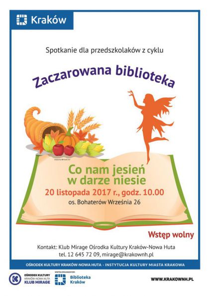 | Klub Mirage Orodka Kultury Krakw-Nowa Huta (os. Bohaterw Wrzenia 26) zaprasza przedszkolaki na wypraw do Zaczarowanej biblioteki w poniedziaek 20 listopada o godz. 10.00. W tym miesicu przedszkolaki wraz z Panem Listopadem dowiedz si, jakie niespodzianki przygotowaa dla nas Pani Jesie. Orzechy, kolorowe licie czy moe deszcz i jesienn szarug. Tego wszystkiego dowiecie si na kolejnym spotkaniu. Serdecznie zapraszamy. Zaczarowana bib(...) ... więcej » |