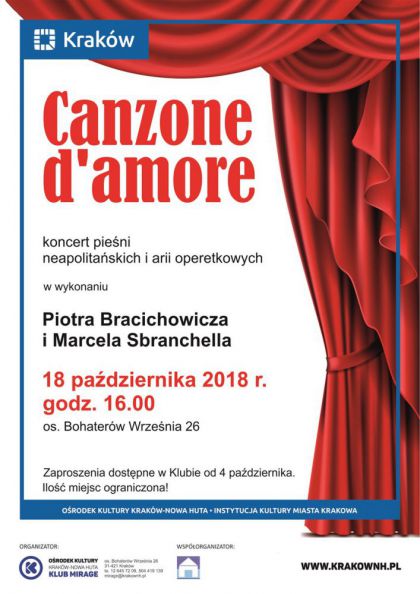Klub Mirage Orodka Kultury Krakw-Nowa Huta (os. Bohaterw Wrzenia 26) zaprasza melomanw 18 padziernika o godz. 16.00 na koncert pieni neapolitaskich oraz arii operetkowych Canzone damore w wykonaniu Piotra Bracichowicza (tenor) oraz Marcela Sbranchella (bas, baryton). Koncert organizowany jest z okazji Dnia Seniora, dlatego pikne gosy i muzyka nie s jedynymi niespodziankami przygotowanymi przez klub.