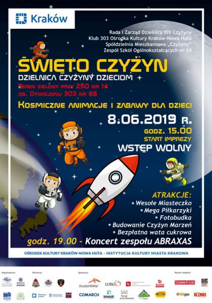 Rada i Zarzd Dzielnicy XIV Czyyny, Orodek Kultury Krakw-Nowa, Spdzielnia Mieszkaniowa Czyyny i Zesp Szk Oglnoksztaccych nr 14 im. w. Brata Alberta (na ktrego terenie odbdzie si wydarzenie) zapraszaj na tegoroczne wita Czyyn, ktrego tematem bdzie KOSMOS. Uczestnicy imprezy zostan zaproszeni do astronautycznej strefy zabaw, w ktrej czeka bdzie na nich budowanie kosmicznych Czyyn Marze stacji orbitalnych i rakiet, p(...)  ... więcej »