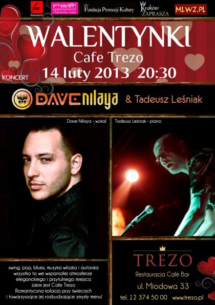 Cafe Trezo zaprasza nawieczr walentynkowy zkoncertem wosko-polskiego duetu Dave Nilaya - wokal & Tadeusz Leniak - piano.