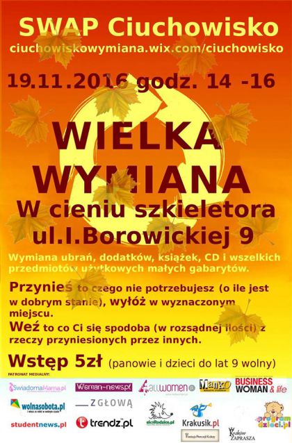 Kolejna edycja szalonej wymiany ubra i dodatkw czyli Krakowskiego Ciuchowiska ju w listopadzie. Widzimy si w Barze "W cieniu szkieletora" (ul. I. Borowickiej 9).