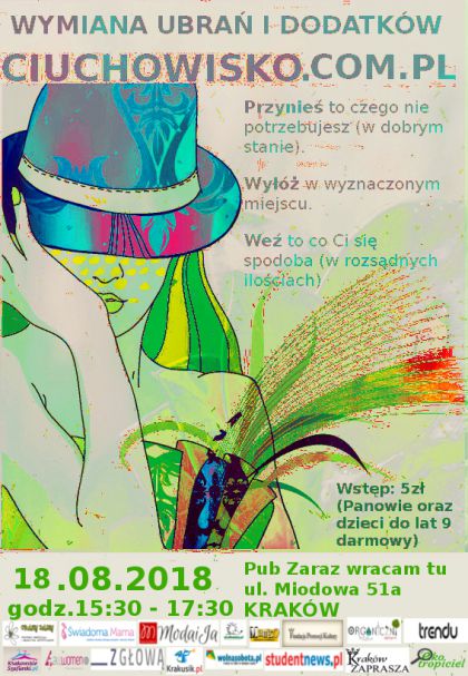 Kolejna edycja szalonej wymiany ubra i dodatkw czyli Krakowskiego Ciuchowiska ju 18 sierpnia. Widzimy si na Kazimierzu w tej samej lokalizacji co ostatnio lokalizacji tj. w Pubie Zaraz wracam tu ul.Miodowa 51a.