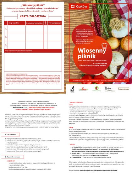 Penomocnik Prezydenta Miasta Krakowa ds. Rodziny i Modzieowy Dom Kultury Dom Harcerza w Krakowie przy ul. Reymonta 18 zapraszaj chtnych w wieku 5 12 lat do wzicia udziau w konkursie kulinarnym Wiosenny piknik z cyklu Gotuj i jedz z gow smacznie i zdrowo! w ramach kampanii Zdrowe ywienie = mdre mylenie.
