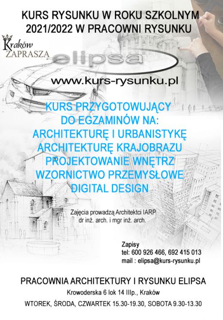 Kurs Rysunku Krakw - Elipsa, przyjmuje osoby zainteresowane zdawaniem egzaminw i przygotowaniem si na studia Architektura i Urbanistyka, Architektura Krajobrazu, Projektowanie Wntrz, Wzornictwo Przemysowe, Digital Design.