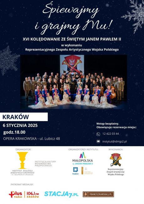6 stycznia 2025 r. w Operze Krakowskiej wybrzmią dźwięki kolejnego już koncertu z cyklu „Kolędowanie ze świętym Janem Pawłem II. Śpiewajmy i grajmy Mu!". To unikatowe wydarzenie, doskonale znane mieszkańcom Małopolski, zapewni nie tylko artystyczne przeżycia na najwyższym poziomie, lecz również przywoła najpiękniejsze wspomnienia wigilijnych wieczorów przepełnionych radością wspólnego kolędowania, co szczególnie pielęgnował Święty Jan Paweł II. Koncert ten, łącząc szerokie muzyczne horyzonty
