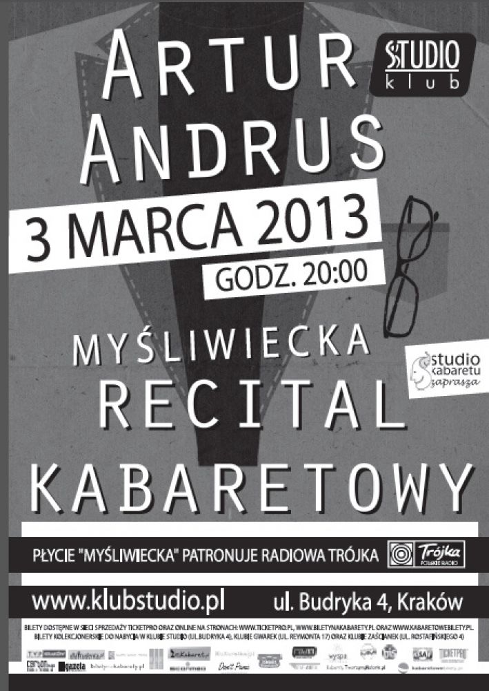 3 marca na scenie Klubu Studio stanie Artur Andrus, znany artysta kabaretowy, dziennikarz i konferansjer. W Krakowie Artur Andrus zaprezentuje swój drugi album pt. "Myliwiecka". Piosenki zabarwione wietnym poczuciem humoru z pewnociš spodobajš się każdemu miłonikowi poezji piewanej i kabaretu.