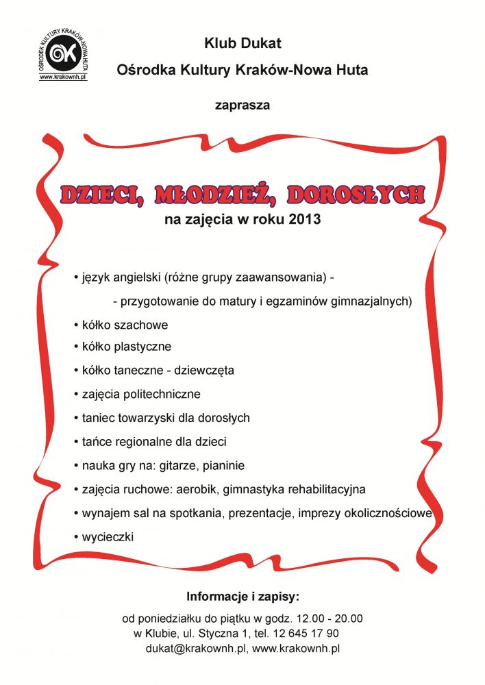 Klub Dukat Oœrodka Kultury Kraków–Nowa Huta, mieszczšcy się przy ul. Stycznej 1 w osiedlu Grębałów, serdecznie zaprasza dzieci i dorosłych do skorzystania z jego oferty.