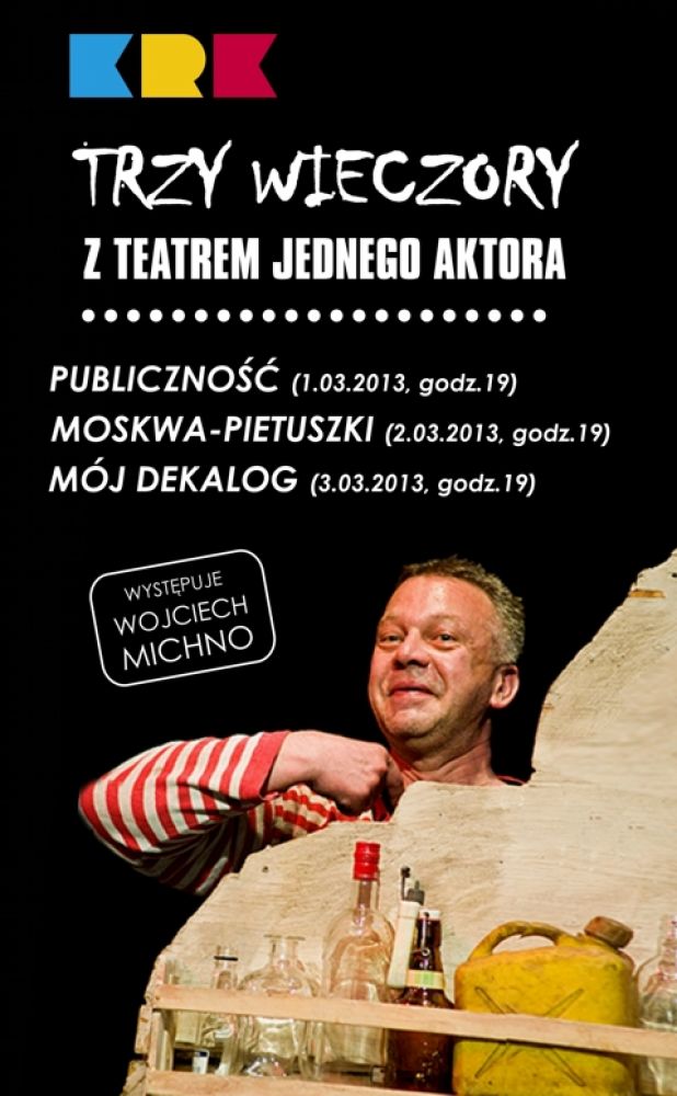 Centrum Sztuki Współczesnej SOLVAY zaprasza na Trzy wieczory z Teatrem Jednego Aktora w wykonaniu Wojciecha Michno, aktora zwišzanego z istniejšcym od roku 1994 Teatrem M.I.S.T., który zaliczany jest do krakowskich scen alternatywnych.