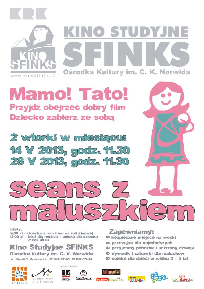 Podczas cyklu SEANS Z MALUSZKIEM proponujemy wspólne, dopołudniowe projekcje dobrych filmów, na które zapraszamy rodziców wraz z dziećmi gwarantujšc szczególnie dobrany repertuar (kino o wysokich walorach zdjęciowych i muzycznych, bez scen przemocy), opiekę dla dzieci w wieku 2-4 lat, zaplecze organizacyjne przyjazne rodzicom (przewijak dla najmłodszych, bezpieczne miejsce na wózki) a także przyjemny półmrok na sali kinowej i œciszony dŸwięk dla tych rodziców, którzy zechcš oglšdnšć film w towarzystwie swojej pociechy. Spotkania odbywajš się w Kinie Sfinks dwa razy w miesišcu, w godzinach dopołudniowych.