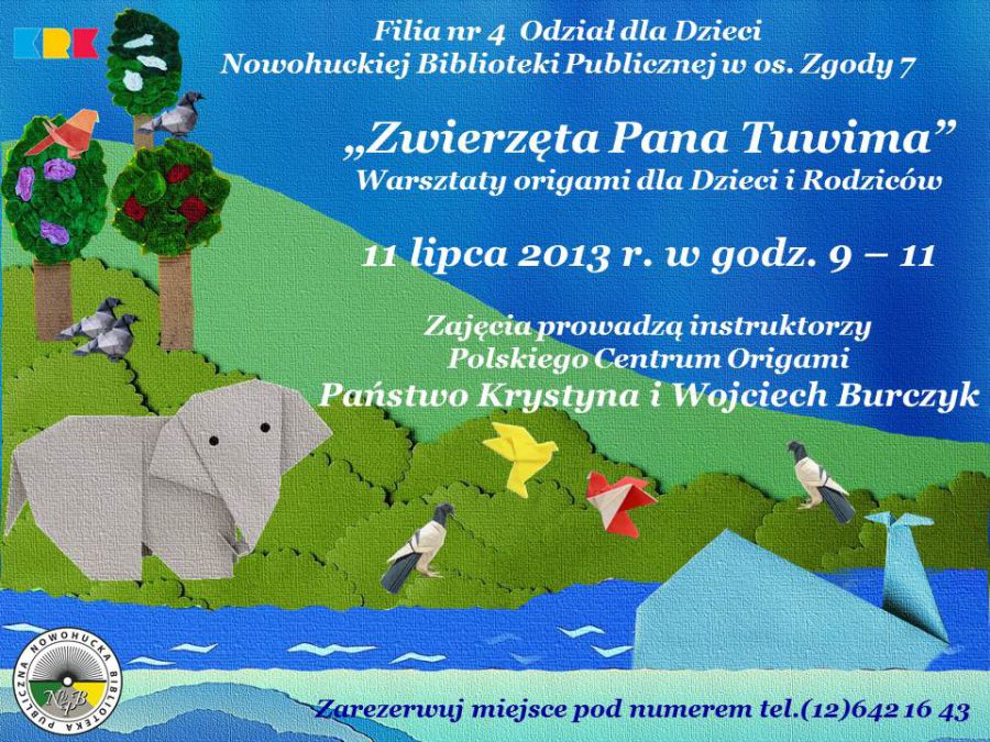 W czasie spotkania dzieci naucz si skadania z papieru ciekawych modeli zwierzt, nie tylko z wierszy Juliana Tuwima. Biblioteka zapewnia materiay i dobr zabaw. Zajcia kierowane s do dzieci od 9 lat. Zapisy w bibliotece.