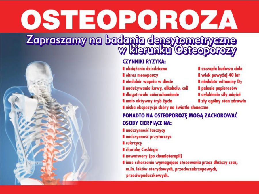 Osteoporoza to stan chorobowy charakteryzujšcy się postępujšcym ubytkiem masy kostnej, osłabieniem struktury przestrzennej koœci oraz zwiększonš podatnoœciš na złamania – informujš eksperci. Najczęœciej chorujš na niš ludzie starsi, lecz tak naprawdę w dzisiejszych czasach, w efekcie siedzšcego trybu życia, słabej ekspozycji na œwiatło i zwišzanego z tym niedoboru witamy D, choroba ta zagraża każdemu. Żeby się przed niš uchronić, warto się przebadać oraz uzyskać poradę u specjalisty.