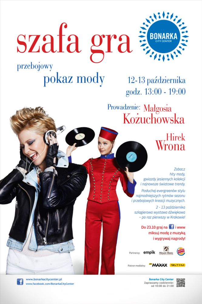 Pokaz poprowadzš, ambasadorka Bonarki Małgorzata Kożuchowska oraz Hirek Wrona, znany dziennikarz muzyczny. Ten ostatni przygotował specjalnš niespodziankę dla klientów krakowskiego centrum: zestaw filmów ilustrowanych muzykš na żywo, prezentujšcych okreœlone muzyczne trendy i to, jak wtedy się ubierano.