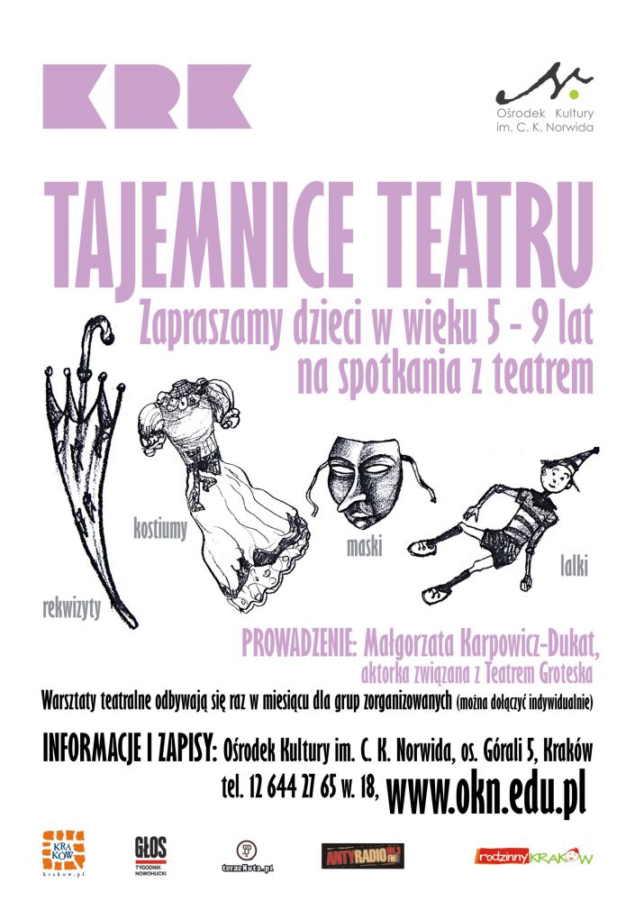 Zapraszamy na warsztaty teatralne dzieci w wieku 5 – 11 lat. Podczas spotkań dzieci poznajš najbliższy dla siebie – teatr lalek – a w nim maski, kostiumy, rekwizyty i różne typy lalek. Ponad to będš się uczyć animacji lalkš oraz odgrywać indywidualnie i zbiorowo krótkie scenki w maskach, kostiumach z rekwizytami.