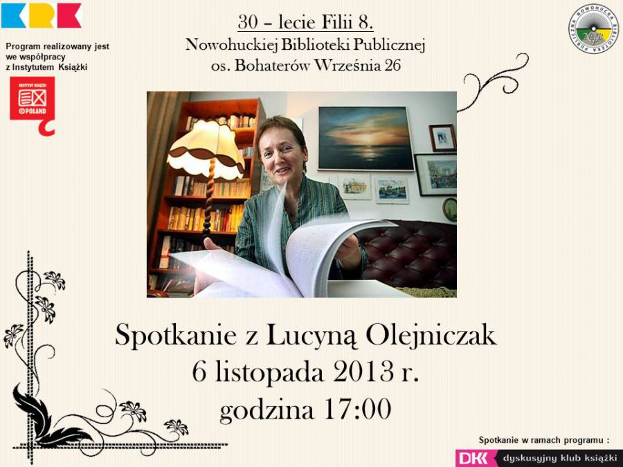 Filia nr 8 Nowohuckiej Biblioteki Publicznej w Krakowie zaprasza na obchody 30-lecia swojej działalnoci. Gociem specjalnym spotkania będzie Lucyna Olejniczak, pisarka, mieszkanka Krakowa, z zawodu laborantka medyczna, były pracownik Katedry Farmakologii Uniwersytetu Jagiellońskiego. Działalnociš pisarskš zajęła się po powrocie ze Stanów Zjednoczonych, wtedy powstała jej pierwsza powieć "Opiekunka, czyli Ameryka widziana z fotela". Jest laureatkš konkursu "Moje podwórko" zorganizowanego w 2002 roku przez krakowskš "Gazetę Wyborczš". Jej pozostałe ksišżki to: "Dagerotyp. Tajemnica Chopina", "Wypadek na ulicy Starowilnej" i "Jestem blisko". Dla fanów autorki jest to wyjštkowa okazja, by się z niš spotkać, porozmawiać, zdobyć autograf i miło spędzić popołudnie. Serdecznie zapraszamy!!!