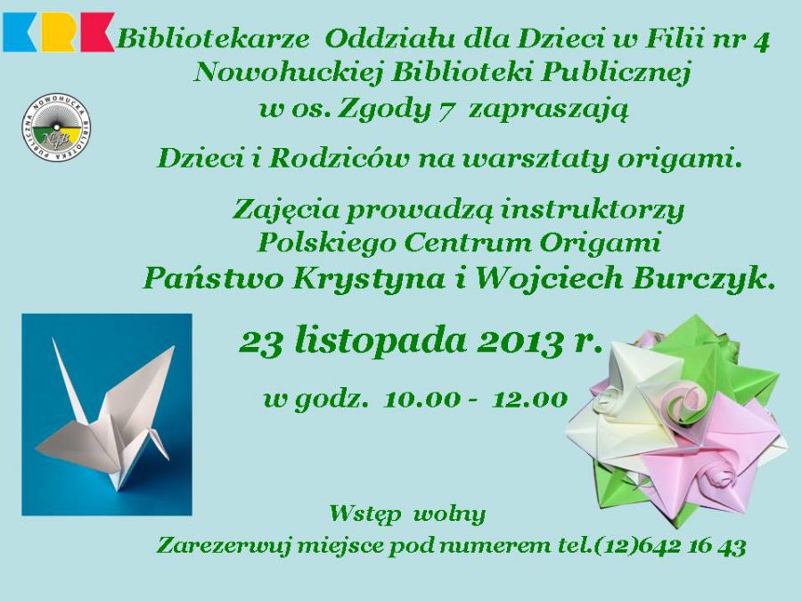 Instruktorzy Polskiego Centrum Origami Państwo Krystyna i Wojciech Burczyk przeprowadzš warsztaty, podczas których nauczš uczestników spotkania składania z papieru ciekawych modeli.Origami to sztuka składania papieru bez nacinania i klejenia, wywodzšca się z tradycji chińskiej, jednak w Japonii rozwinęła się najbardziej. Warsztaty sš okazjš, aby nauczyć się czegoœ nowego. Biblioteka zapewnia papier i materiały potrzebne do zabawy. Zapisy w bibliotece.