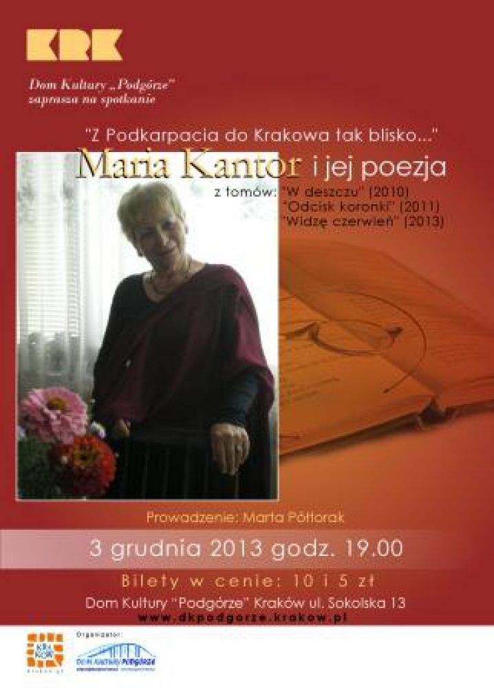 3 grudnia w DK Podgórze odbędzie się spotkanie z poezja Marii Kantor krakowskiej poetki pochodzšcej z Podkarpacia.