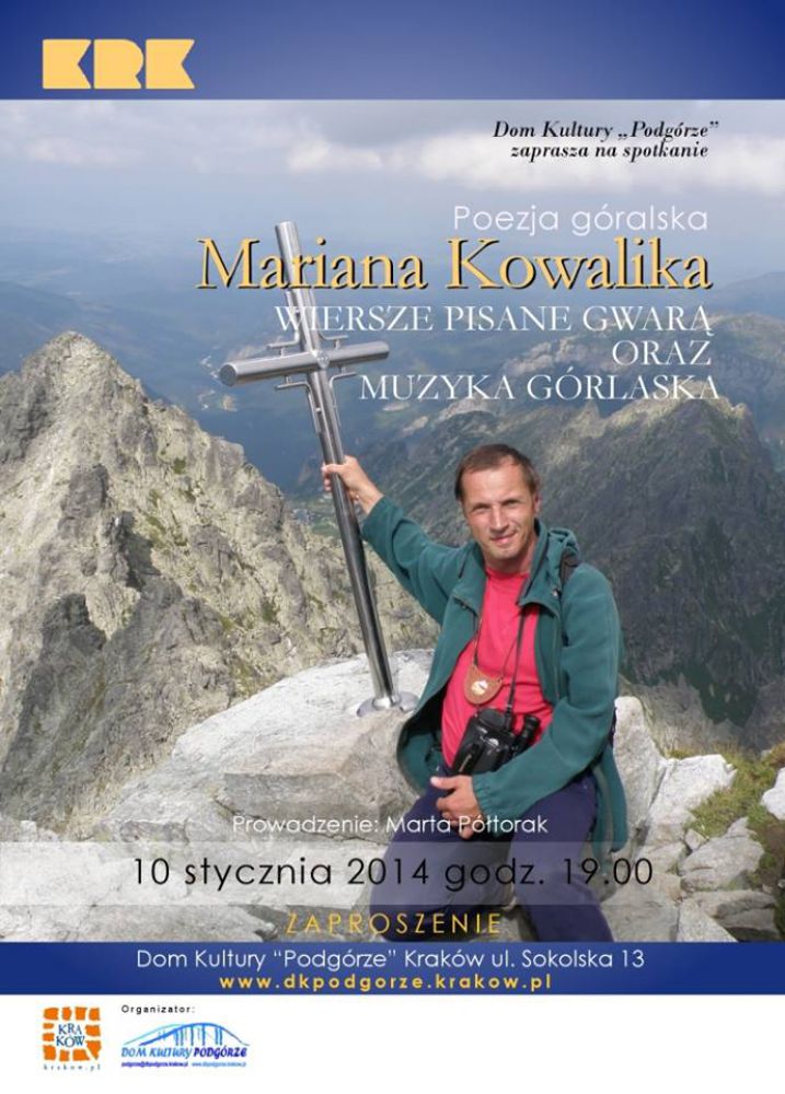 W Nowym Roku zapraszamy na kolejne spotkania z poezjš w Podgórzu. Już 10 stycznia pierwsze spotkanie z poezjš Mariana Kowalika wiersze pisane gwarš oraz muzyka góralska. Podczas wieczoru usłyszymy także wiersze pisane w innych niż polska gwarach karpackich w języku słowackim i ukraińskim (z polskim tłumaczeniem).