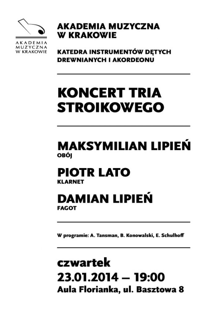 W czwartek, 23 stycznia o godzinie 19:00 w Auli Florianka przy ul. Basztowej 8 odbędzie się Koncert Tria Stroikowego w składzie:
