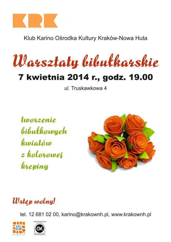 Bibułkarstwo, to niezwykła forma rękodzieła i nieodłšczny element małopolskiej tradycji. Na kwietniowych zajęciach w Klubie Karino Oœrodka Kultury Kraków-Nowa Huta(ul. Truskawkowa 4)poznać będzie można techniki wykonywania bibułkowych kwiatów z kolorowej krepiny. Podczas warsztatów powstanš palmy, które zostanš zgłoszone na konkurs na najpiękniejszš palmę wielkanocnš w Lipnicy Murowanej.