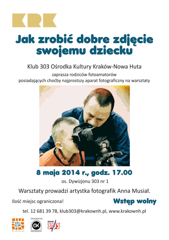 Warsztaty dla rodziców fotoamatorów w Klubie 303 Orodka Kultury Kraków-Nowa Huta (os. Dywizjonu 303 nr 1) dotyczšce podstawowych zasad fotografowania swoich pociech. W ramach zajęć, które odbędš się 8 maja o godz. 17.00, uczestnicy zapoznani zostanš z zasadami fotografowania obejmujšcymi kompozycję zdjęcia, operowanie wiatłem i kolorem. Poznane reguły obowišzujšce w fotografii, rodzice będš mogli wykorzystać na miejscu, korzystajšc z praktycznych rad prowadzšcej. Zajęcia poprowadzi Anna Musiał, która zajmuje się fotografiš zawodowo od kilku lat, a od roku współprowadzi warsztaty fotograficzne w Bibliotece Publicznej w Zielonkach. Informacje i zapisy w Klubie (tel. 12 681 39 78, klub303@krakownh.pl).