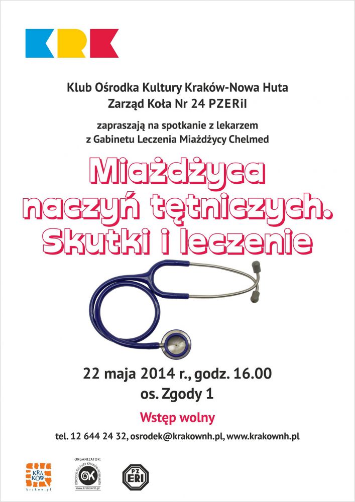 Spotkanie z lekarzem z Gabinetu Leczenia Miażdżycy Chelmed w Klubie Oœrodka Kultury Kraków-Nowa Huta (os. Zgody 1) na temat jednej z najgroŸniejszych chorób cywilizacyjnych. Uczestnicy będš mieć okazję wysłuchać czym jest miażdżyca, jakie czynniki wpływajš na jej rozwój. Dowiedzš się także w jaki sposób zmniejszyć ryzyko jej występowania w organizmie. Współorganizatorem spotkania jest Zarzšd Koła nr 24 PZERiI.