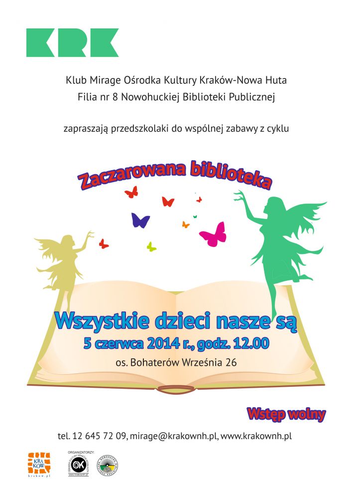 Klub Mirage Orodka Kultury Krakw-Nowa Huta (os. Bohaterw Wrzenia 26) zaprasza 5 czerwca o godz. 12.00 na spotkanie dla przedszkolakw w ramach cyklu Zaczarowana biblioteka. Warsztaty prowadzone w oparciu o bajki takie jak Brzydkie kacztko czy Calineczka powicone bd zagadnieniu tolerancji. Wsporganizatorem wydarzenia jest Filia nr 8 Nowohuckiej Biblioteki Publicznej.