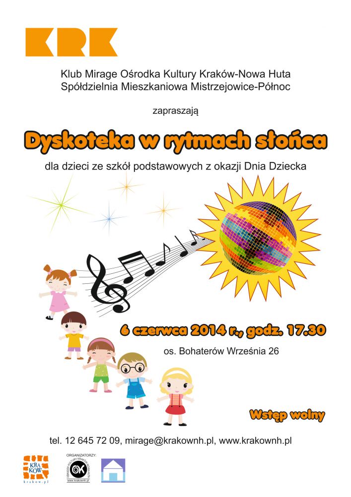 Klub Mirage Oœrodka Kultury Kraków-Nowa Huta (os. Bohaterów Wrzeœnia 26) zaprasza 6 czerwca o godz. 17.30 na imprezę z konkursami da uczniów szkół podstawowych z okazji Dnia Dziecka. W wakacyjny klimat wprowadzi DJ Radi. Dobra zabawa gwarantowana. Współorganizatorem spotkania jest Spółdzielnia Mieszkaniowa Mistrzejowice-Północ.