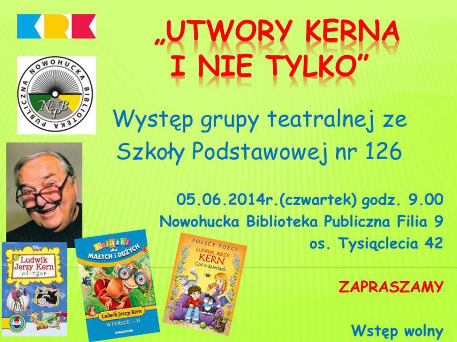 Biblioteka zaprasza na wystp pt. Utwory Kerna i nie tylko w wykonaniu grupy teatralnej ze Szkoy Podstawowej nr 126 w Krakowie. Spotkanie odbdzie si w cyklu: Dzieci dzieciom. Uczennice pod opiek Pani Anny Szczepaniak Korczyskiej zaprezentuj ciekawe interpretacje wierszy Ludwika Kerna, znanego krakowskiego poety, satyryka, dziennikarza.