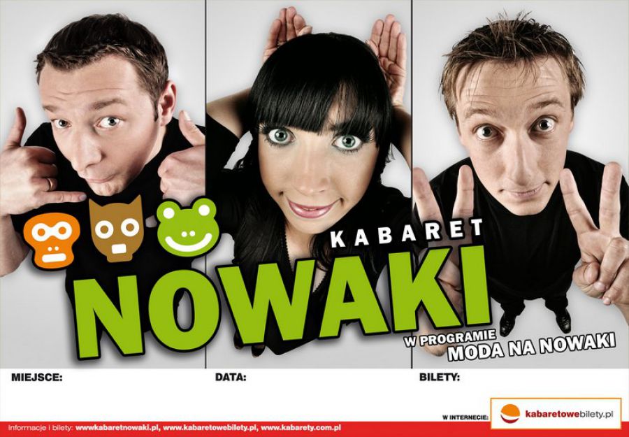 Najnowszy program trójki zielonogórskich artystów Adrianny Borek, Tomasza Marciniaka i Kamili Piróg „Moda na Nowaki” to dowód na to, jak popularnym i lubianym kabaretem jest obecnie ten zespół. W spektaklu kabaret przedstawia swoje największe hity i cały wachlarz absurdalnych i zaskakujšcych postaci, które sš zabawnš odpowiedziš na naszš codziennoœć. Nowaki zgłębiajš tematykę kobiecego wybierania się na przyjęcia i męskiego spojrzenia na ten problem. Ich skecze dotyczš także perypetii nauczycieli na wycieczce klasowej, dylematów generała na zakupach i ostrzegajš przed pewnym osobliwym hotelem.