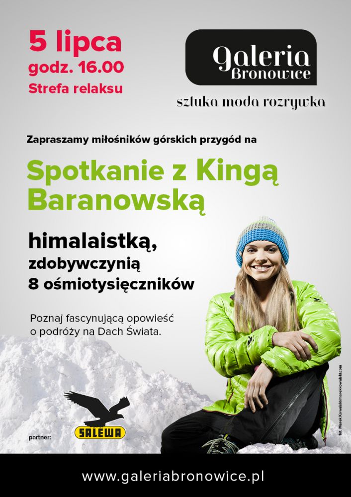 Po spotkaniu, które odbędzie się w Strefie Relaksu (parter galerii), w sklepie Salewa można będzie zdobyć autograf Kingi Baranowskiej na pamištkowej fotografii oraz zrobić sobie wspólne zdjęcie.