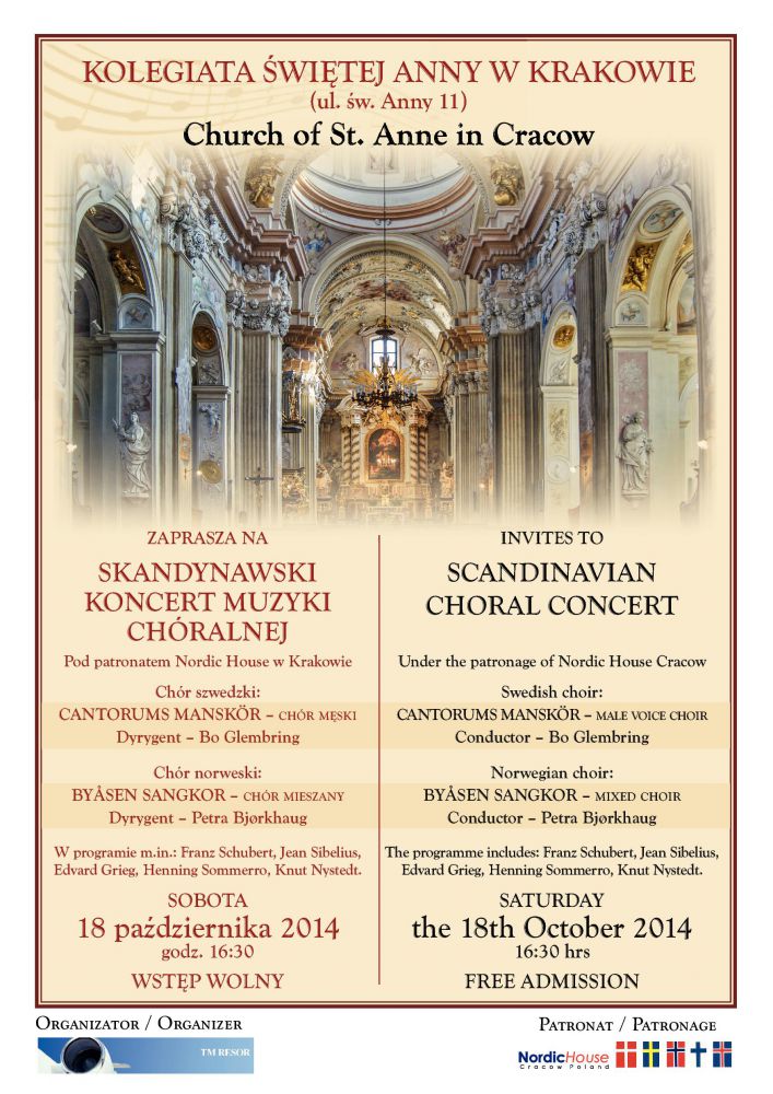 W sobotę , 18 paŸdziernika o godz.16:30, w Kolegiacie Œw.Anny w Krakowie (ul. Œw.Anny 11) odbędzie się koncert chórów ze Szwecji i Norwegii: chór męski Cantorums oraz chór mieszany Byåsen.