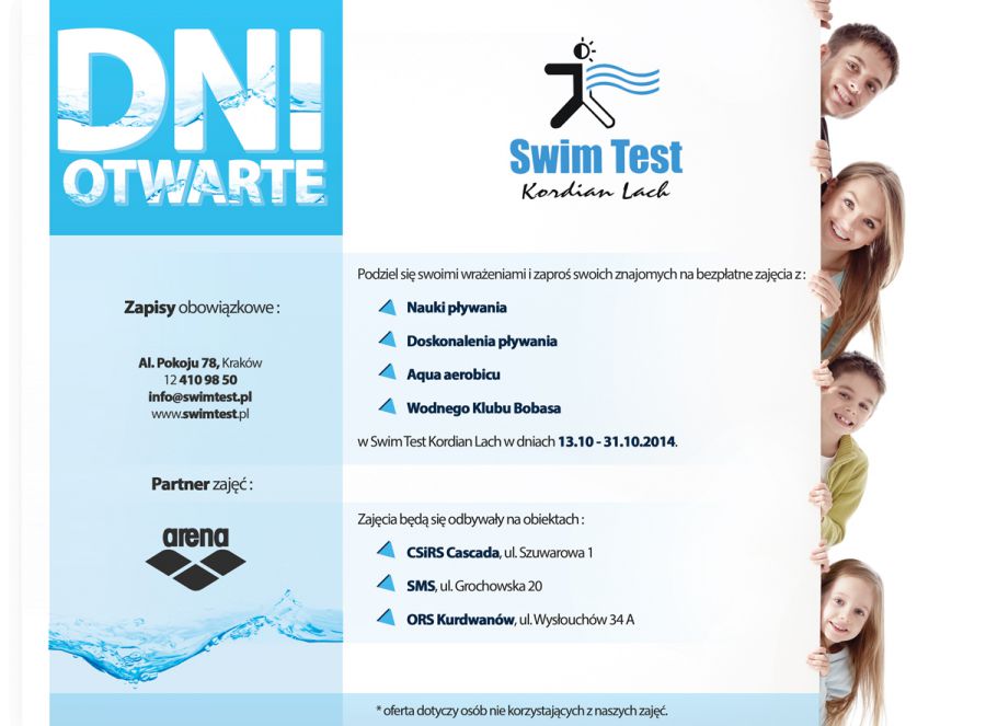 Dni otwarte Swim Test Kordian Lach od 13 do 31 paŸdziernika 2014. Obowišzkowe zapisy w BOK Swim Test: al. Pokoju 78, Kraków, info@swimtest.pl. Partnerem zajęć jest ARENA.