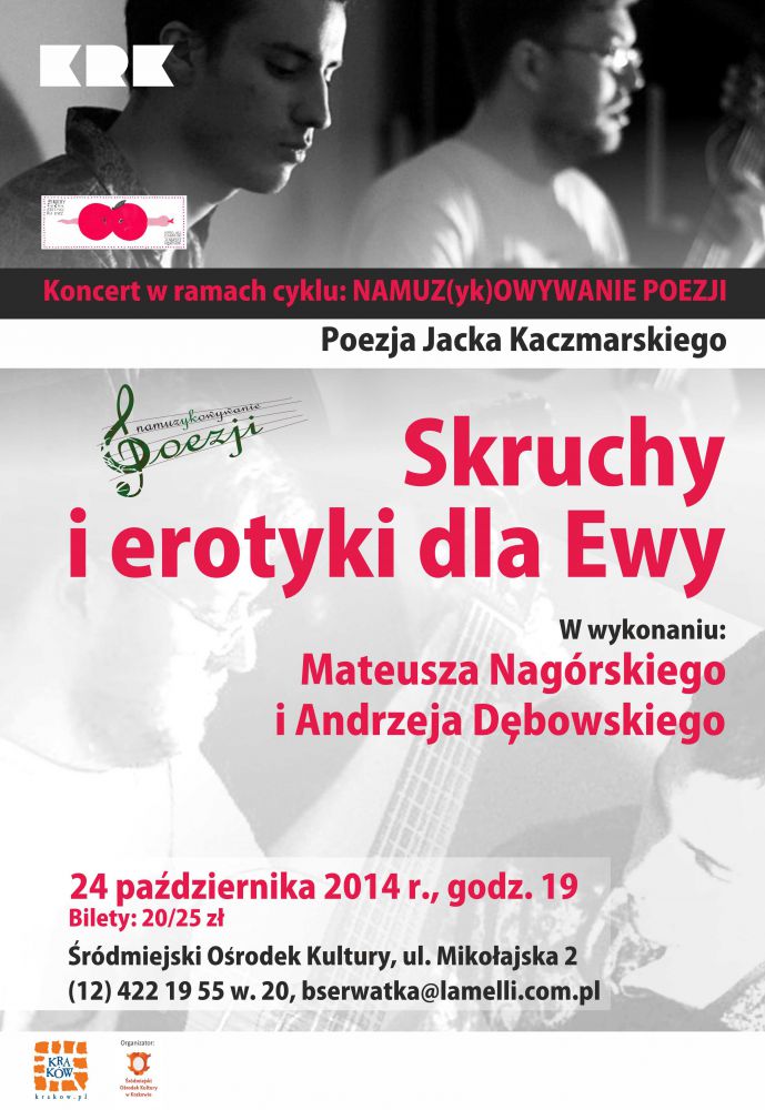 W ramach cyklu "Namuz(yk)owywanie poezji" koncert Mateusza Nagórskiego i Andrzeja Dębowskiego "Skruchy i erotyki dla Ewy"