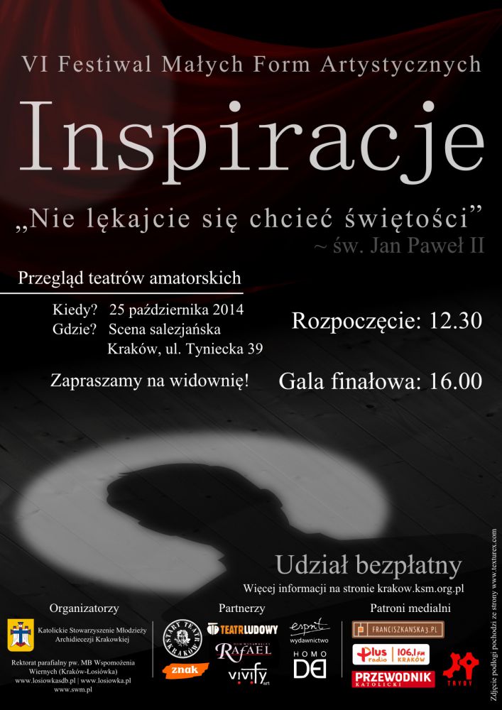 Zapraszamy na widownię kolejnej, już VI edycji Festiwalu Małych Form Artystycznych „Inspiracje”, który odbędzie się 25 PaŸdziernika 2014 na Scenie Salezjańskiej.